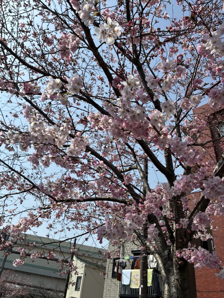 近所の川沿いに並ぶ桜並木が開花し始めました。